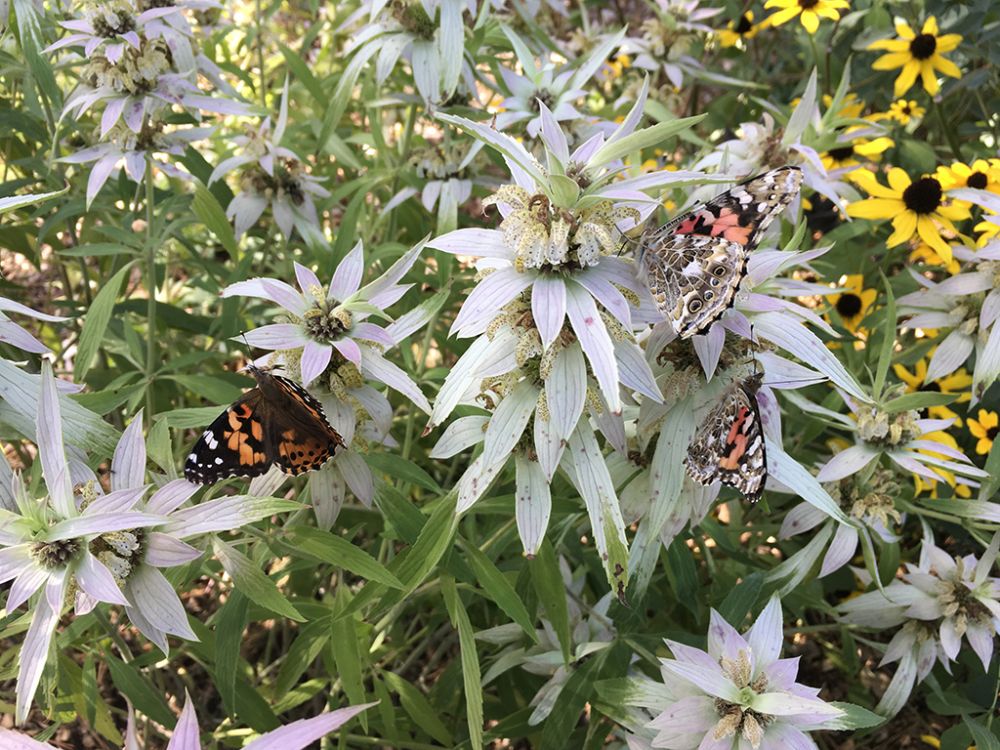 Monarda punctata. One of the most popular prairie flowers among pollinators. Typically found in fields, dry prairies, savannas, meadows, plains and pastures. Attracts a large variety of wildlife and pollinators including songbirds, hummingbirds, butterflies, bees, wasps and other insects. Grows well in dry to mesic soil conditions in full sunlight. Ranges from 2-3′ in height. One of our most unique wildflowers. Tiered pink, white, green and yellow blossoms bloom in mid to late Summer.