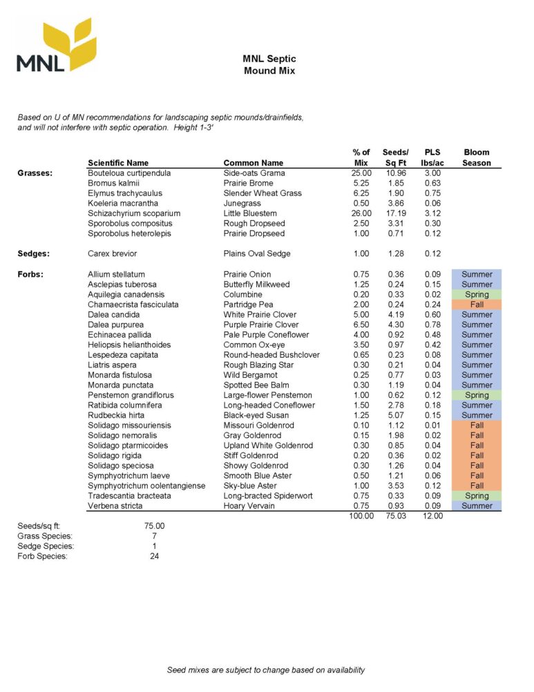 Designed to provide stable and attractive ground cover and erosion control in poor quality septic mound soils. A great way to add beneficial native habitat and eye appeal to unattractive septic mounds. Height 1-3’